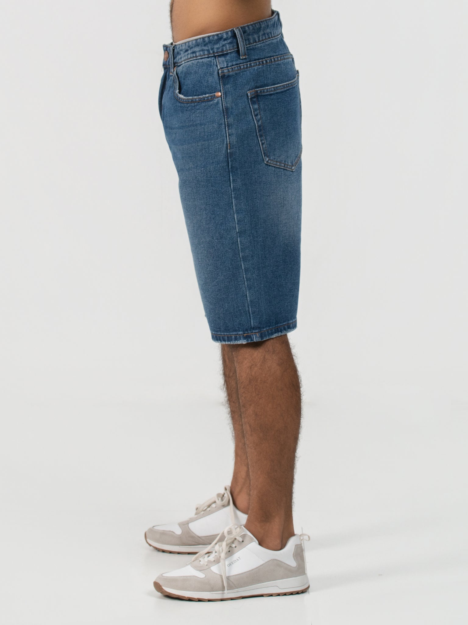 This short denim fashion piece in classic blue features a plain texture for a clean, versatile look. Crafted from durable denim, it combines style with lasting comfort, ideal for expert wardrobe essentials.