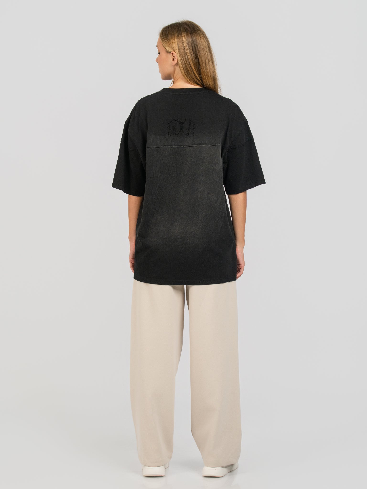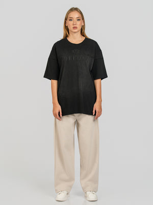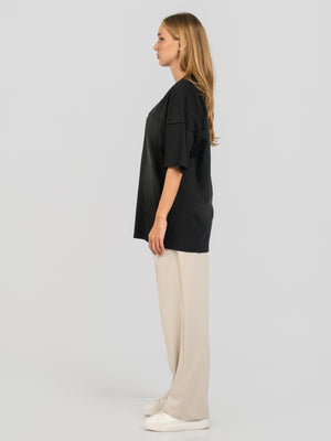 This oversized fashion t-shirt from the DEETOPIA Collection comes in a stylish black shade, offering a minimal and modern look. Designed with a classic crew neck and a trendy curved hem, it provides both comfort and a relaxed silhouette.