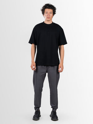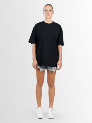 stylish oversized t-shirt comes in a versatile black color, crafted from high-quality single jersey fabric for superior comfort. Featuring a classic crew neck, short sleeves, and a standard hem, it offers a relaxed yet trendy fit. The plain texture is elevated with applique embellishments, adding a unique touch to the design. Perfect for a modern and effortless look.