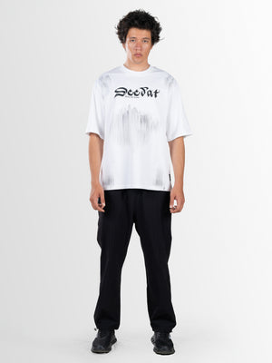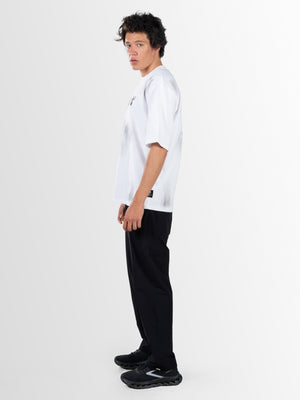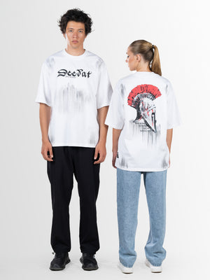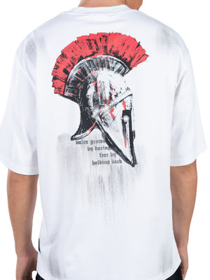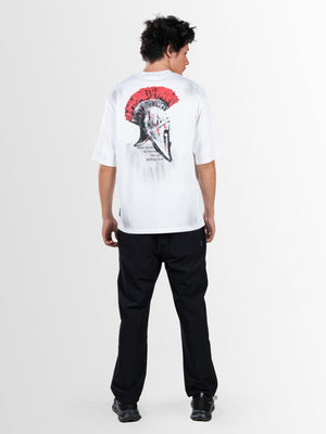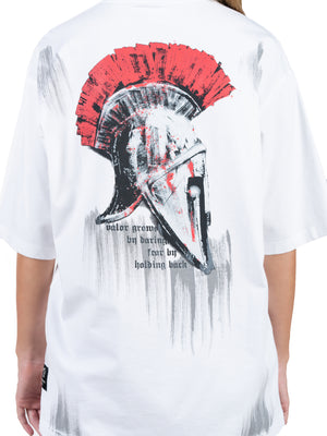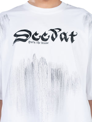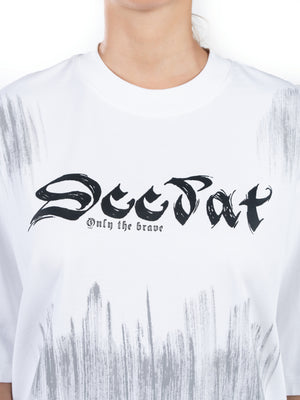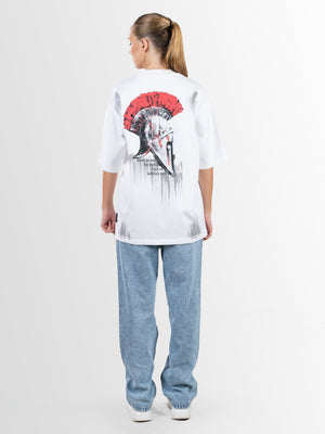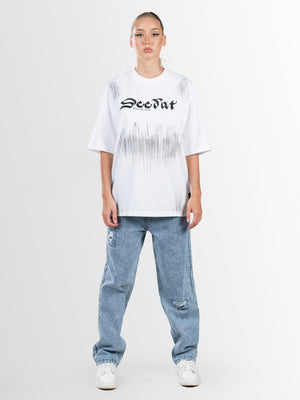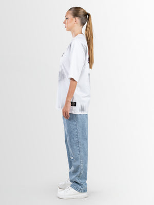 The white oversized crew neck t-shirt features a standard hem and short sleeves, offering a relaxed and stylish fit. Made from high-quality single jersey fabric, it ensures comfort and durability. The printed texture adds a trendy touch, making it a versatile fashion staple.