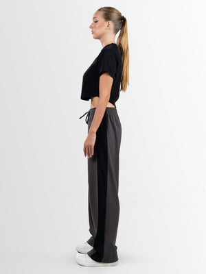 This fashionable cropped t-shirt comes in a vibrant black color, crafted from high-quality interlock fabric for a soft and comfortable feel. Designed with a classic crew neck and short sleeves, it offers a stylish yet relaxed fit. The plain texture is beautifully enhanced with delicate embroidery, adding a unique touch to the design. Available in size XS, this piece is perfect for a trendy and effortless look.
