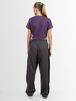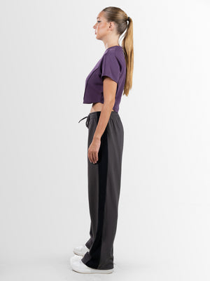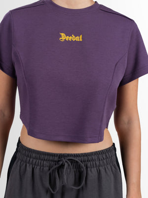 This fashionable cropped t-shirt comes in a vibrant purple color, crafted from high-quality interlock fabric for a soft and comfortable feel. Designed with a classic crew neck and short sleeves, it offers a stylish yet relaxed fit. The plain texture is beautifully enhanced with delicate embroidery, adding a unique touch to the design. Available in size XS, this piece is perfect for a trendy and effortless look.