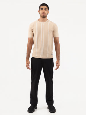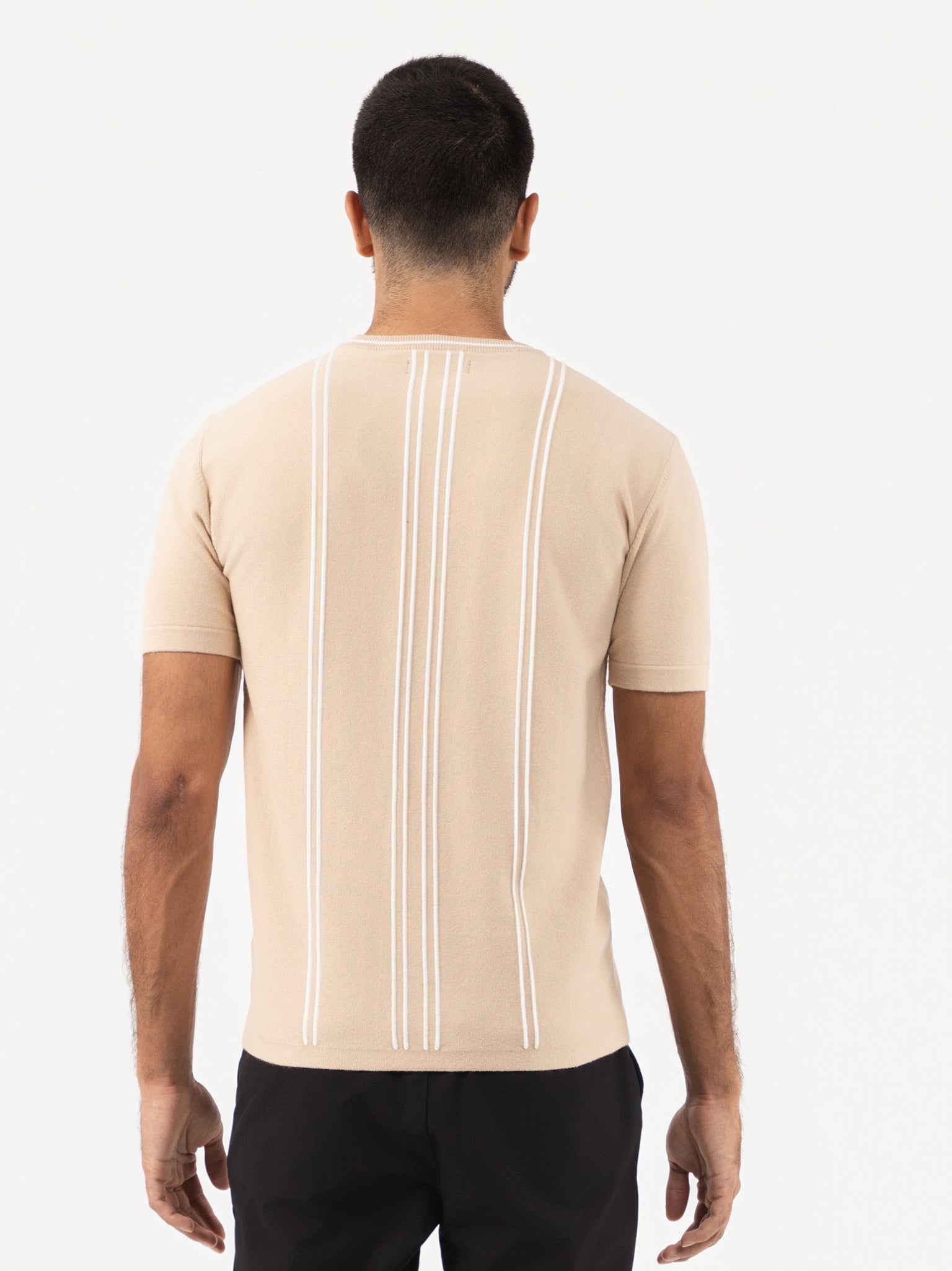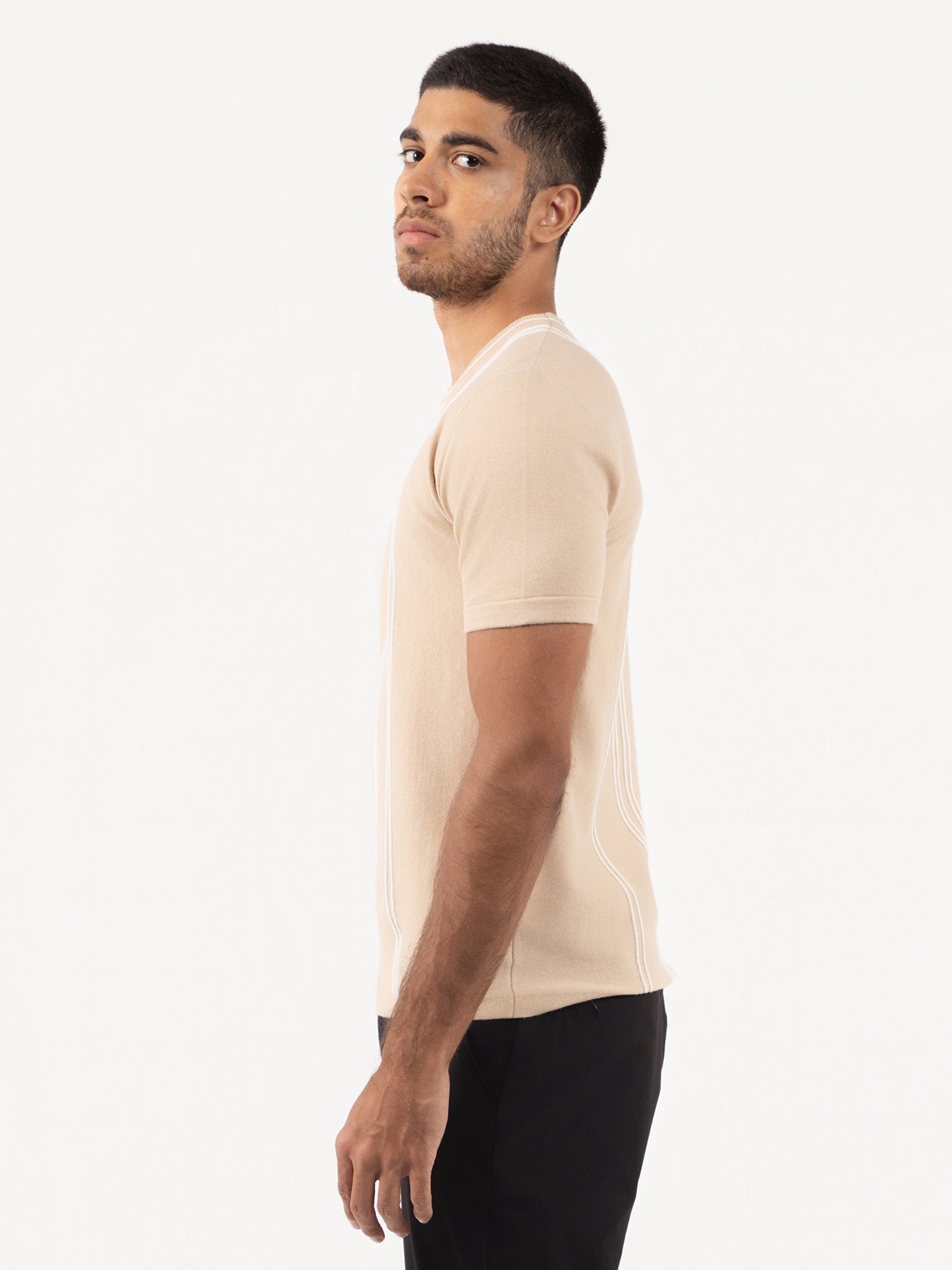 This beige slim-fit shirt combines a classic crew neck with short sleeves and a distinctive stripe texture, crafted from high-quality flat knit fabric. Part of the Leonardo collection, it delivers a contemporary fashion statement while maintaining comfort and precision tailoring, ideal for those seeking a refined yet modern wardrobe staple.