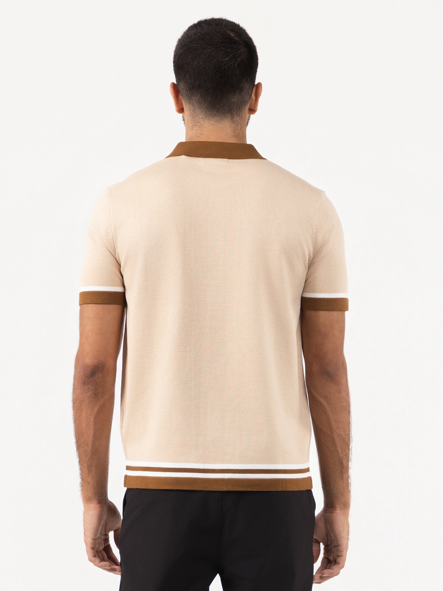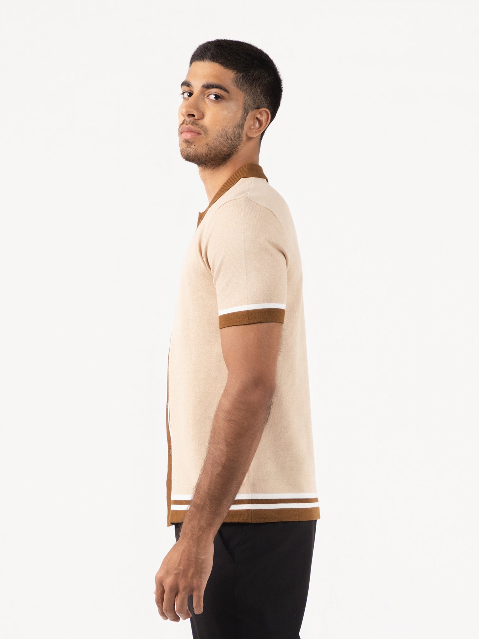 This slim-fit, short-sleeve shirt in beige features a distinctive Cuban collar and a plain texture crafted from flat knit material. Part of the Portofino collection under the Leonardo concept, it offers a refined fashion statement with a comfortable, tailored fit suited for sophisticated summer wear.