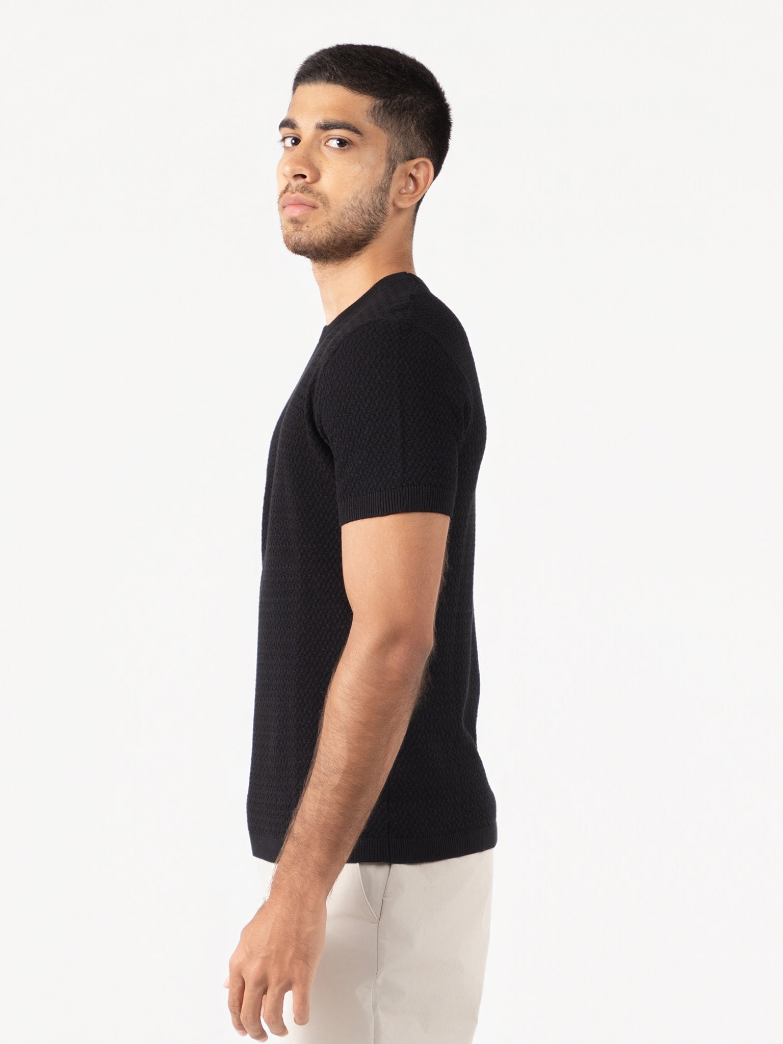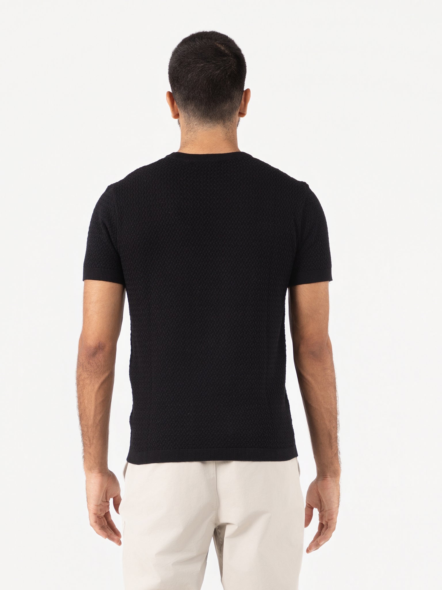 This slim fit black short-sleeve tee from the Portofino collection features a subtle stripe texture crafted from flat knit fabric for a refined appearance. Designed with a classic crew neck, it combines contemporary fashion with expert tailoring, ensuring a sleek silhouette and comfortable wear throughout the day. Ideal for those seeking understated elegance with a modern edge.