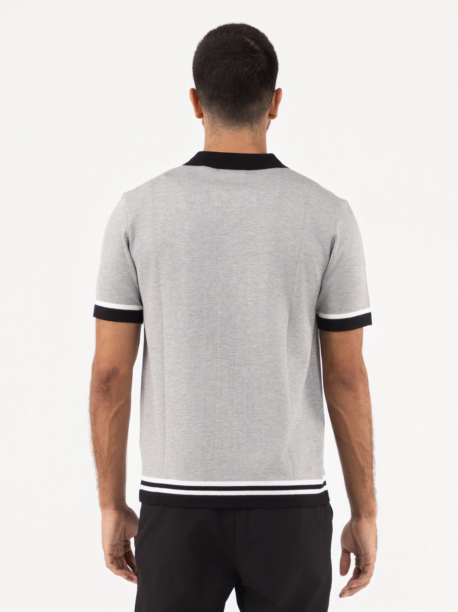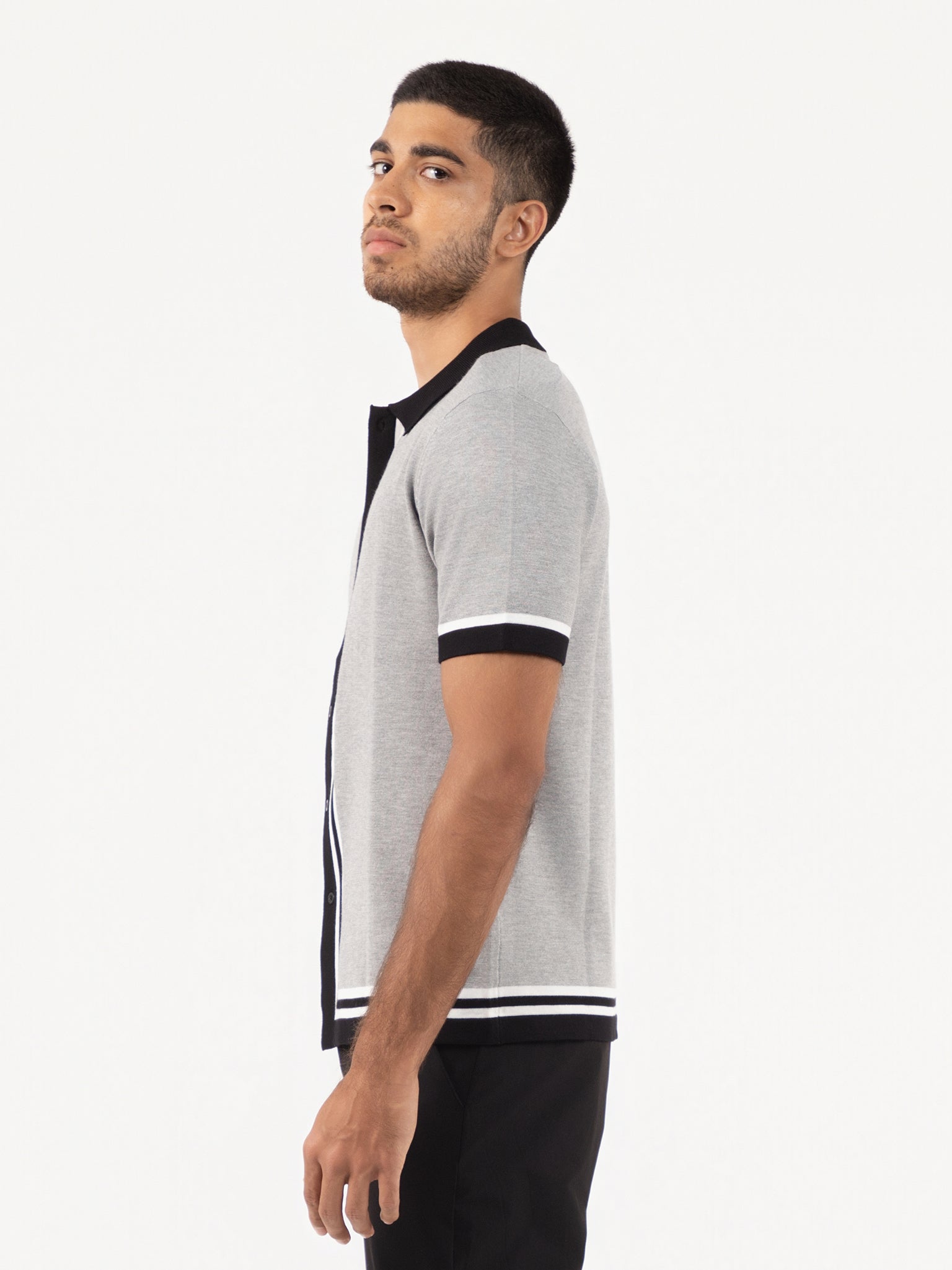 This slim fit shirt in grey features a short sleeve design with a stylish Cuban collar, crafted from flat knit material for a smooth, comfortable texture. Part of the Portofino collection and inspired by the Leonardo concept, it offers a refined, plain finish ideal for a modern fashion look. Its form-fitting cut enhances silhouette, making it a versatile choice for both casual and upscale occasions.