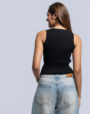 DEEDAT PORTOFINO Women's Tank Top - Black Elevate your everyday wardrobe with this essential sleeveless tank top, crafted from a premium viscose poly blend that delivers exceptional softness and breathability. The classic crew neckline and minimalist design create a versatile foundation piece that transitions seamlessly from casual days to layered styling. The fabric's natural drape flatters your silhouette while maintaining comfort throughout the day. Whether worn solo or as a layering base, this tank combines timeless sophistication with contemporary ease—a wardrobe staple that works harder than it looks.