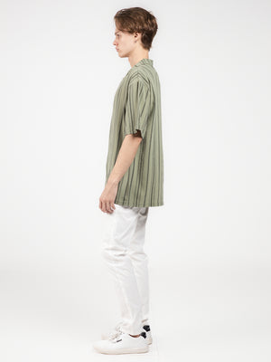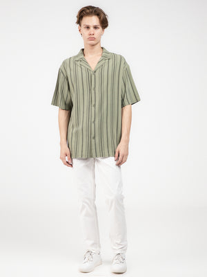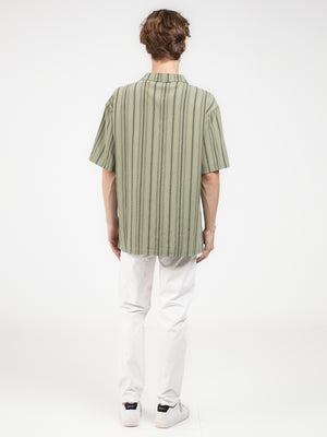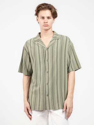 This green fashion shirt features a printed texture with short sleeves, a Cuban collar, and a regular fit, crafted from structured material with a standard hem cut.