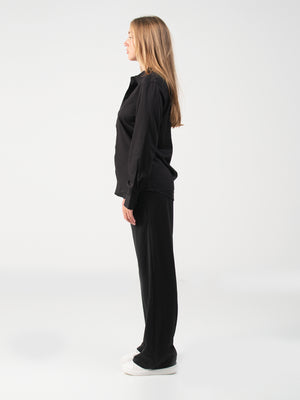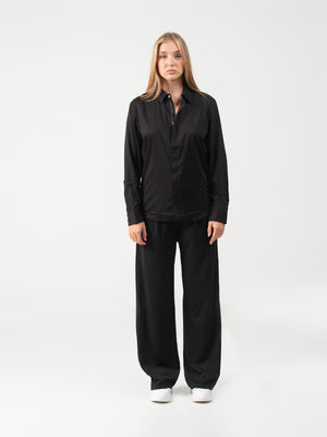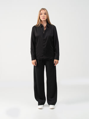 This black fashion shirt features a plain texture with long sleeves, a cutaway collar, and a standard hem, crafted from poly viscose fabric for a sleek, refined look.