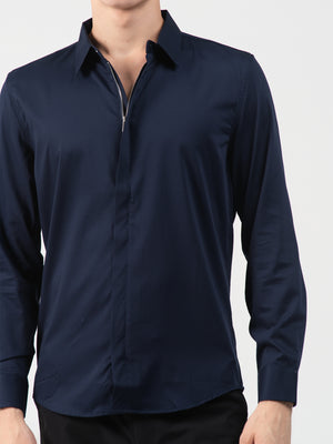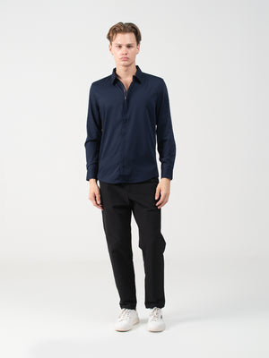 This navy fashion shirt features a plain texture with long sleeves, a cutaway collar, and a standard hem, crafted from poly viscose fabric for a sleek, refined look.