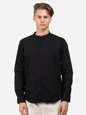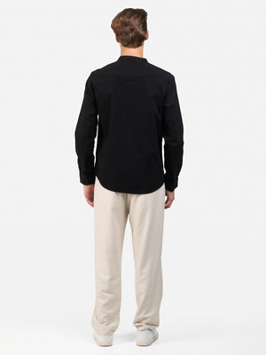 Crafted from plain black cotton, this fashion piece features a slim fit, long sleeves, a Chinese collar, and a standard hem for a sleek, contemporary look.