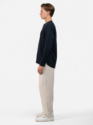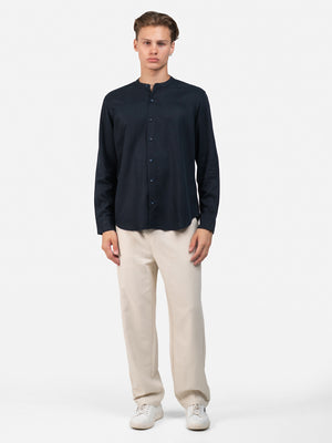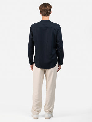 Crafted from plain navy cotton, this fashion piece features a slim fit, long sleeves, a Chinese collar, and a standard hem for a sleek, contemporary look.