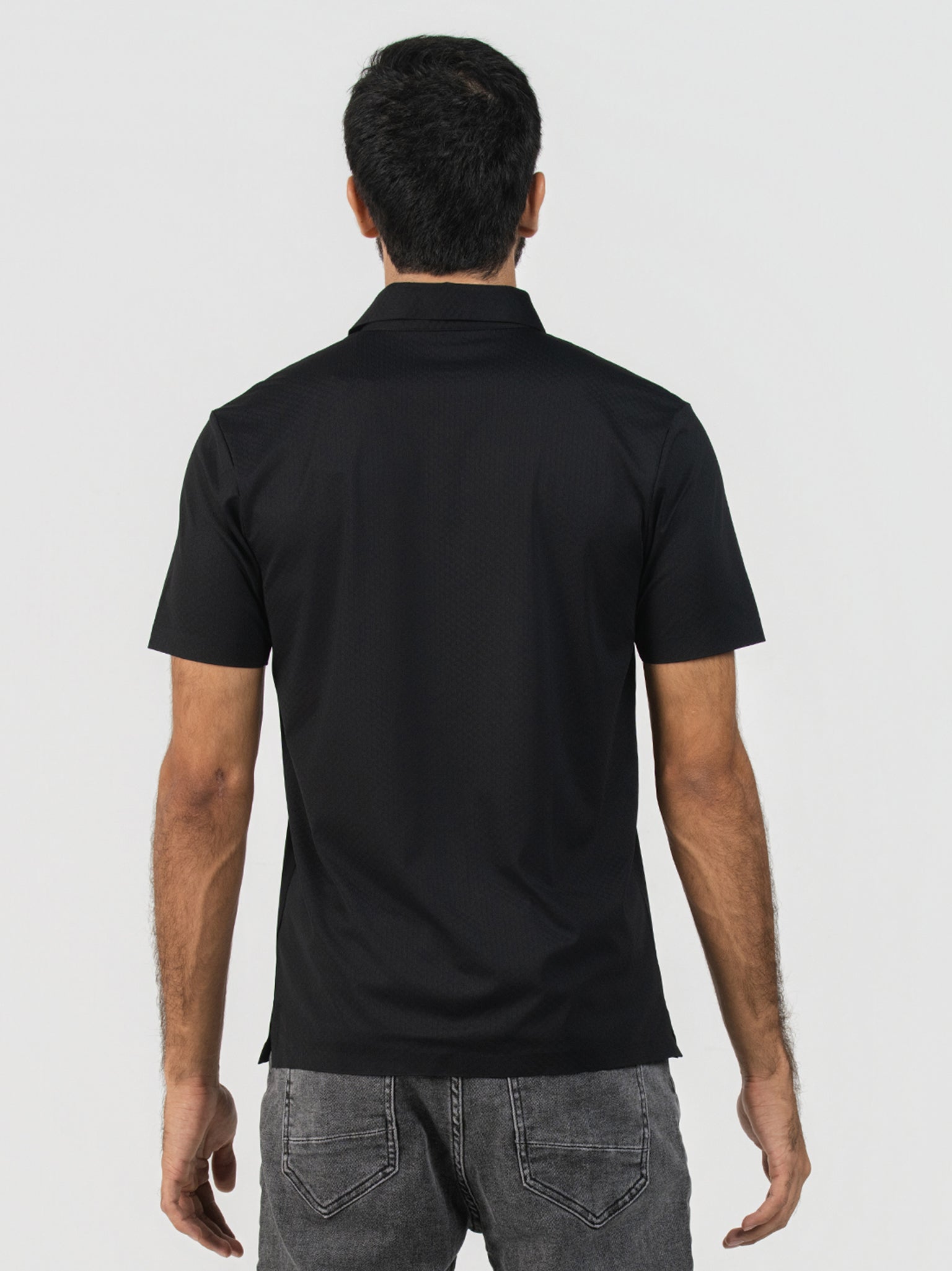 This black short-sleeve polo features a slim fit with a standard hem, offering a clean, streamlined silhouette. Crafted with a plain texture, it brings a subtle sophistication ideal for fashion-conscious individuals seeking a versatile wardrobe staple. The polo collar enhances its classic look, making it suitable for both casual and semi-formal occasions.