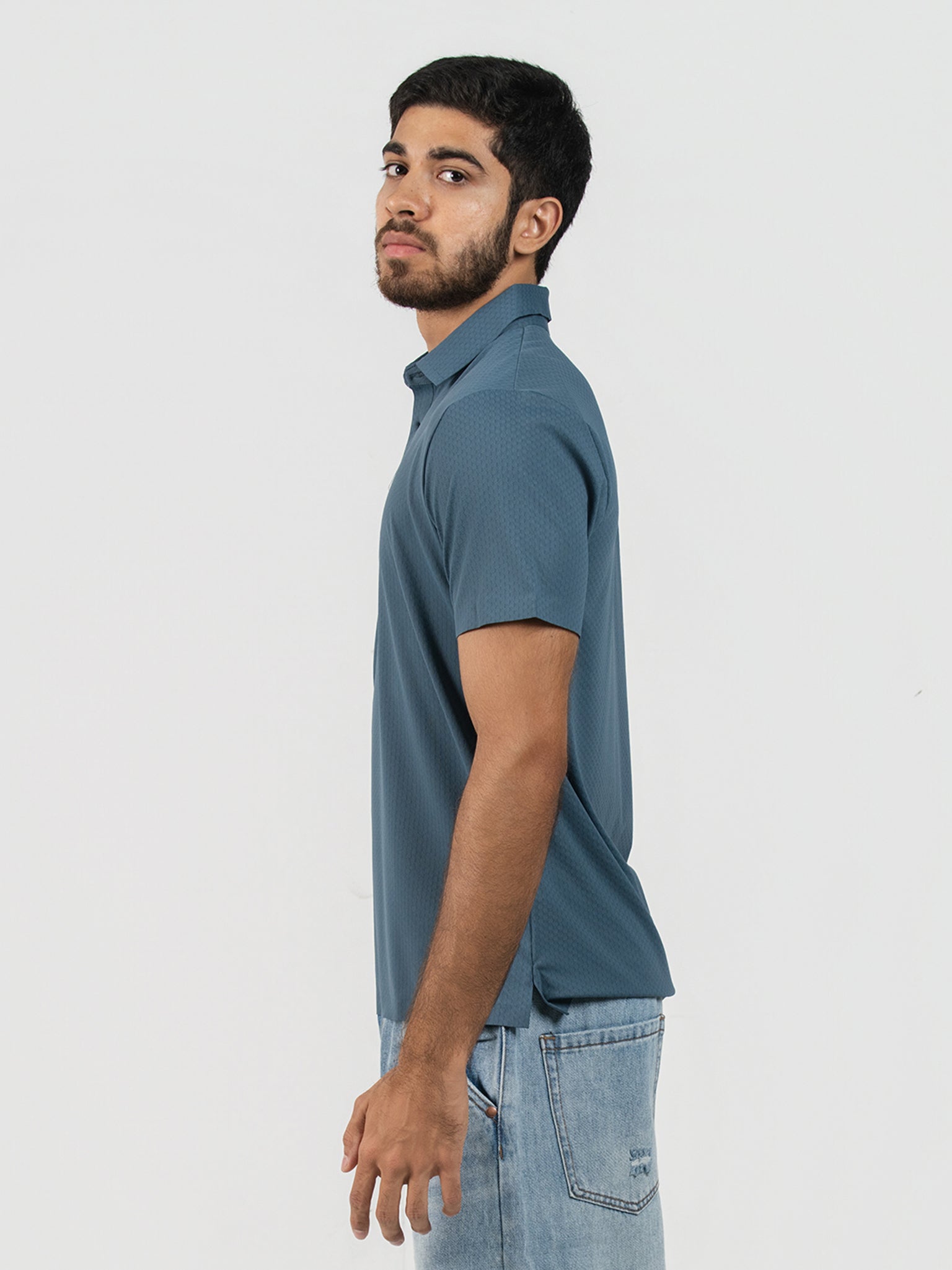 This teal short-sleeve polo features a slim fit with a standard hem, offering a clean, streamlined silhouette. Crafted with a plain texture, it brings a subtle sophistication ideal for fashion-conscious individuals seeking a versatile wardrobe staple. The polo collar enhances its classic look, making it suitable for both casual and semi-formal occasions.