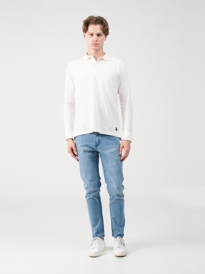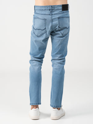 This trendy fashion piece is crafted from premium light blue denim with a plain texture. Designed in a tapered fit, it offers a sleek and modern look, perfect for any occasion
