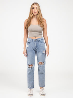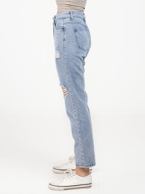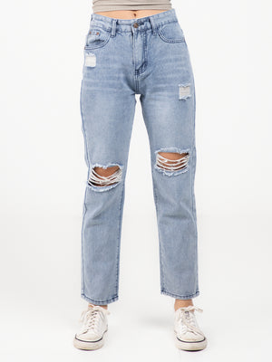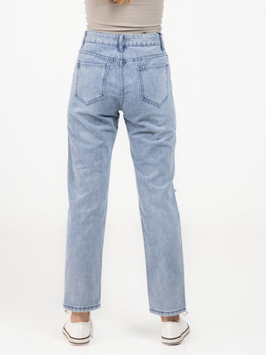 Crafted from plain light blue denim, this long piece features a high-waist design, straight cut, and is finished with a single-button embellishment for a timeless and flattering silhouette.