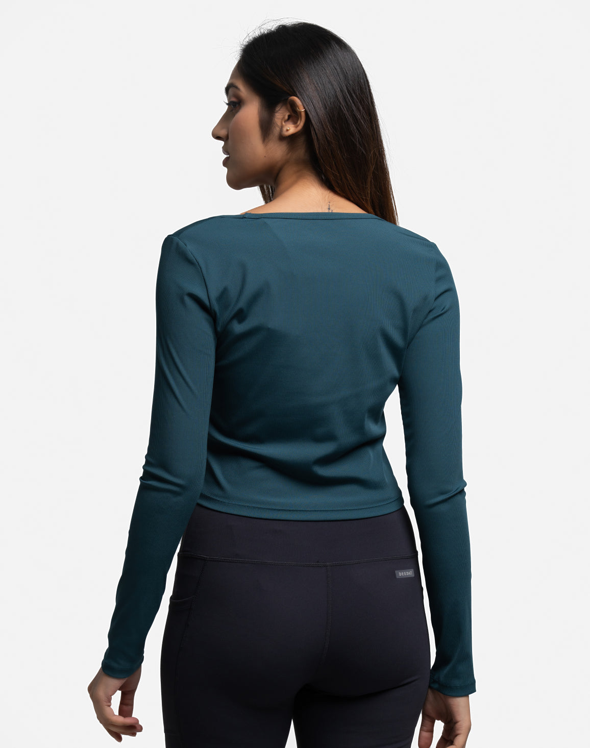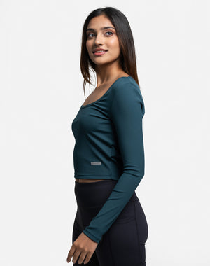 This long-sleeve fashion top features a sleek green color with a classic crew neck for versatile styling. Crafted from a blend of polyester and spandex, it offers both durability and a comfortable stretch fit. The plain texture is enhanced by a subtle stripe embellishment, adding a refined detail to its minimalist design. Ideal for those seeking a polished yet comfortable wardrobe staple.