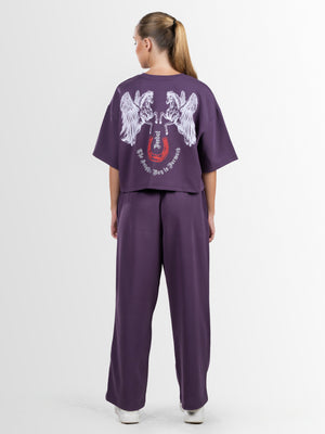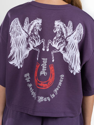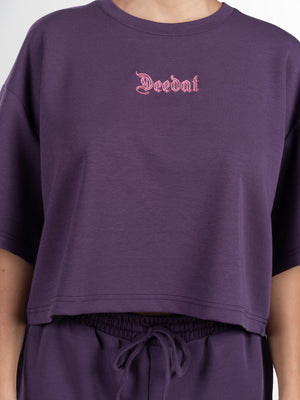 This oversized, short-sleeve fashion crop top comes in a plain purple interlock fabric, featuring both screen print and embroidery embellishments. It has a crew neck design and is part of the 'Only the Brave' collection, made in the Dominican Republic.