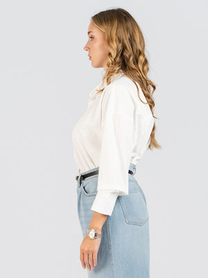 Elevate your everyday wardrobe with this versatile women's shirt blouse, expertly crafted for modern style. Featuring a crisp white finish with a refined cutaway collar and long sleeves, this piece combines classic sophistication with contemporary ease. The oversized fit provides comfortable movement while maintaining a polished silhouette, while the curved hem adds a subtle design detail that sets it apart. Perfect for layering, dressing up, or wearing solo, this fashion-forward blouse transitions seamlessly from office to weekend wear.