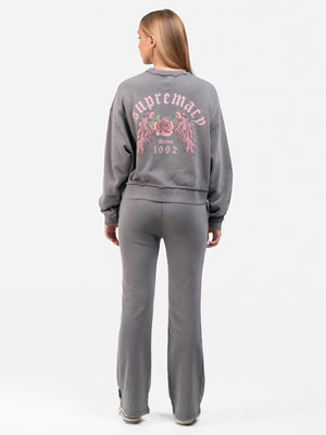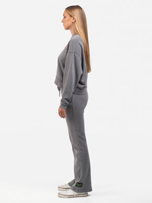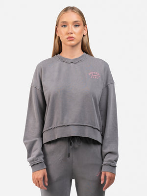 From the Sicko Mode collection, this cropped fashion piece is made from acid-wash gray terry fabric, featuring a crew neck, long sleeves, and finished with bold screen print embellishment for a standout streetwear look.